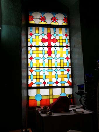 Buntglasfenster am Altar in der Kirche in Brasovo. 1998